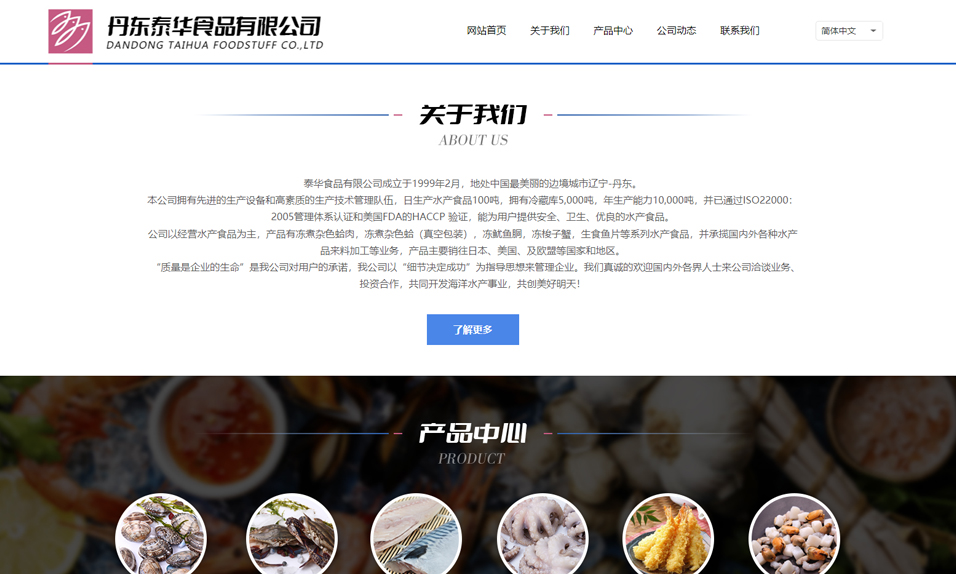泰華食品有限公司成立于1999年2月,地處中國最美麗的邊境城市遼寧-丹東。本公司擁有先進(jìn)的生 產(chǎn)設(shè)備和高素質(zhì)的生產(chǎn)技術(shù)管理隊伍,日生產(chǎn)水產(chǎn)食品100噸,擁有冷藏庫5,000噸,年生產(chǎn)能力10,000噸,并已通過ISO22000:2005管 理體系認(rèn)證和美國FDA的HACCP 驗證,能為用戶提供安全、衛(wèi)生、優(yōu)良的水產(chǎn)食品。